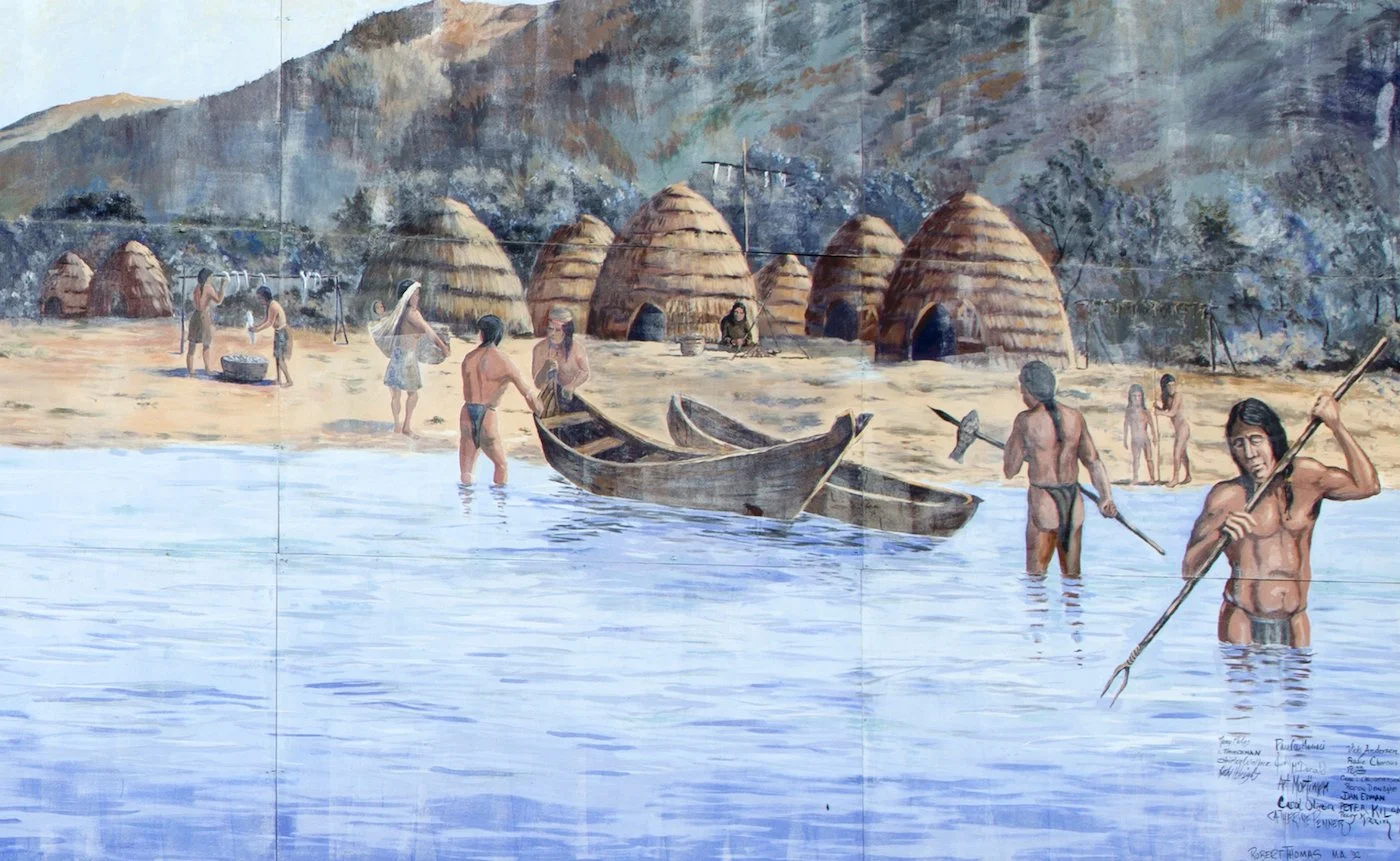 Depiction of Coastal Chumash from a mural in Lompoc gives a sense of the village where the Portola Expedition camps for the night in 1769 (Section of Lompoc mural); The Early Years of Rancho Tajiguas Preserve By Hattie Beresford (Montecito Journal, 2019).