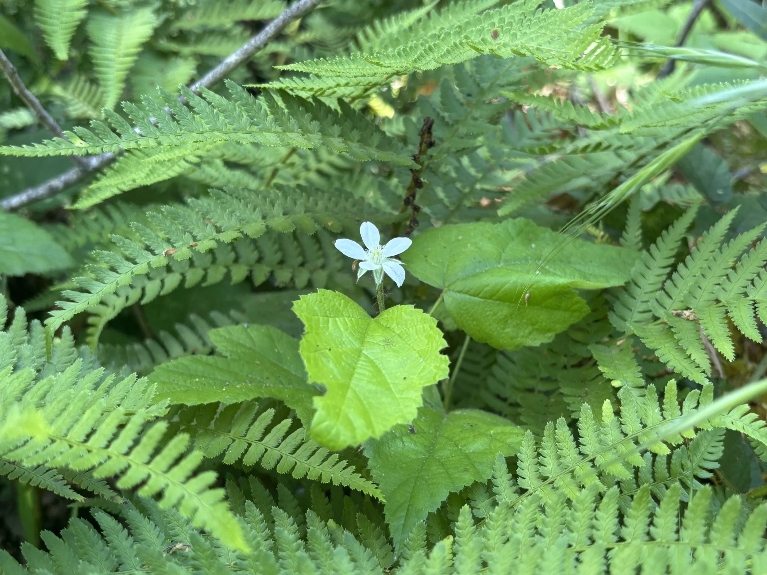 Small white flower with five petals surrounded by lush green fern leaves and other green foliage.
