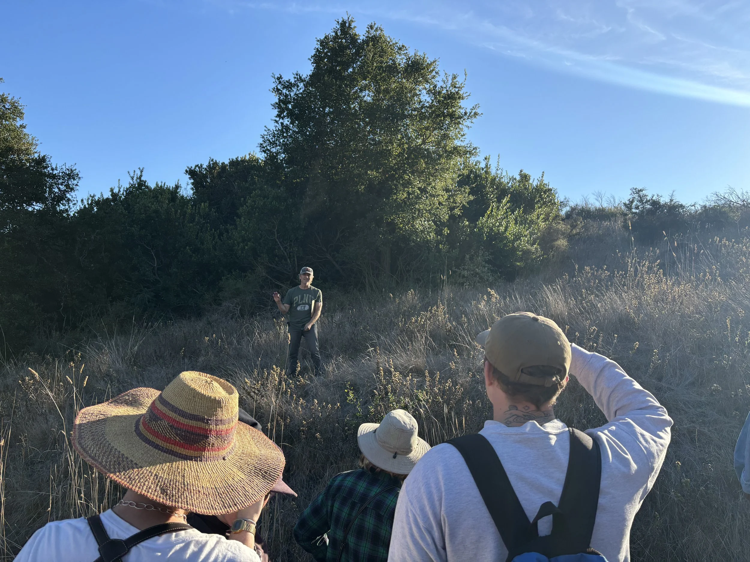 SBCC Professor Mike Gonella points out native perennial purple needlegrass amongst the annual grasses at Rancho Tajiguas Preserve to students (November 6, 2024)